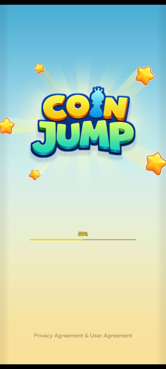 The loading screen shows the Coin Jump logo with stars and a progress bar at 50%, giving it a polished, game-like feel. At the bottom, it includes “Privacy Agreement & User Agreement,” which is typical for apps trying to look legitimate.