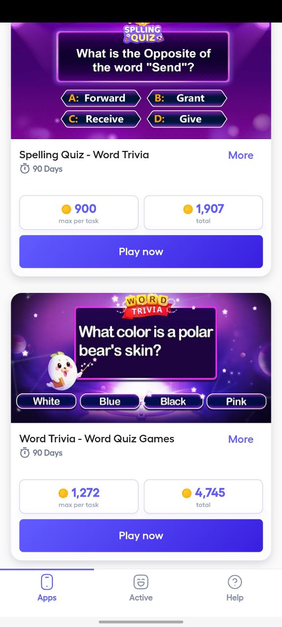 • “Word Trivia” → 1,272 coins per task