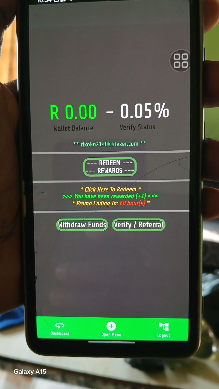 - Dashboard – Shows your wallet balance (R 0.00 in one example) and “Verify Status” (which starts at -0.05%).