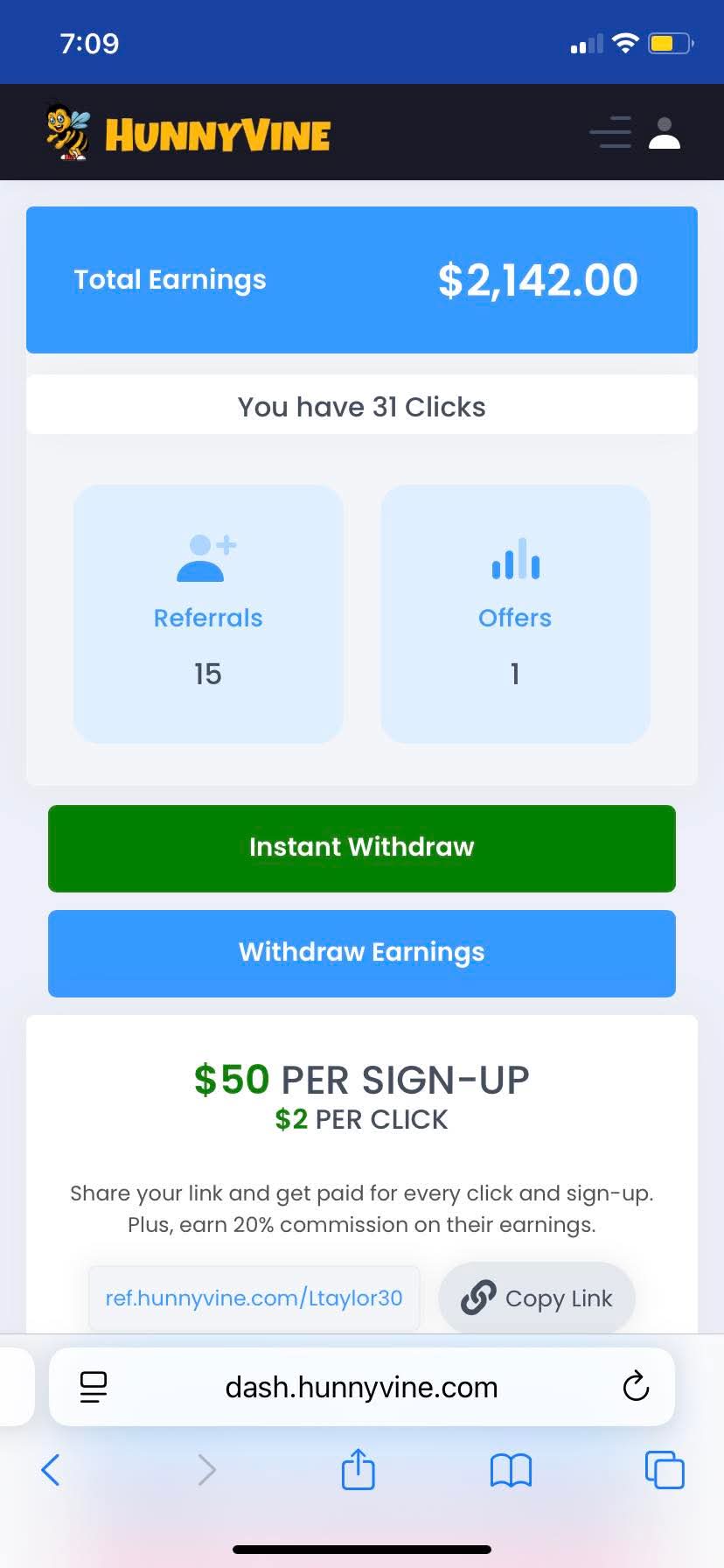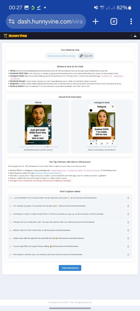 This is the big one—they push it hard. You get a unique link like ref.hunnyvine.com/YourUsername. For every unique click on your link, you earn $2. If someone signs up through it, bam—$50 bonus per sign-up. Plus, a 20% commission on whatever your referrals earn from their own offers or referrals. They say "Earn Together, Win Together!" and encourage sharing on social media. There's even a "Top 10 Earners This Week" list with names like Parra ($11,956 from 131 referrals) to make it look legit. Tips include posting in Facebook groups, using hashtags like #sidehustle or #moneytok, and partnering with micro-influencers.
