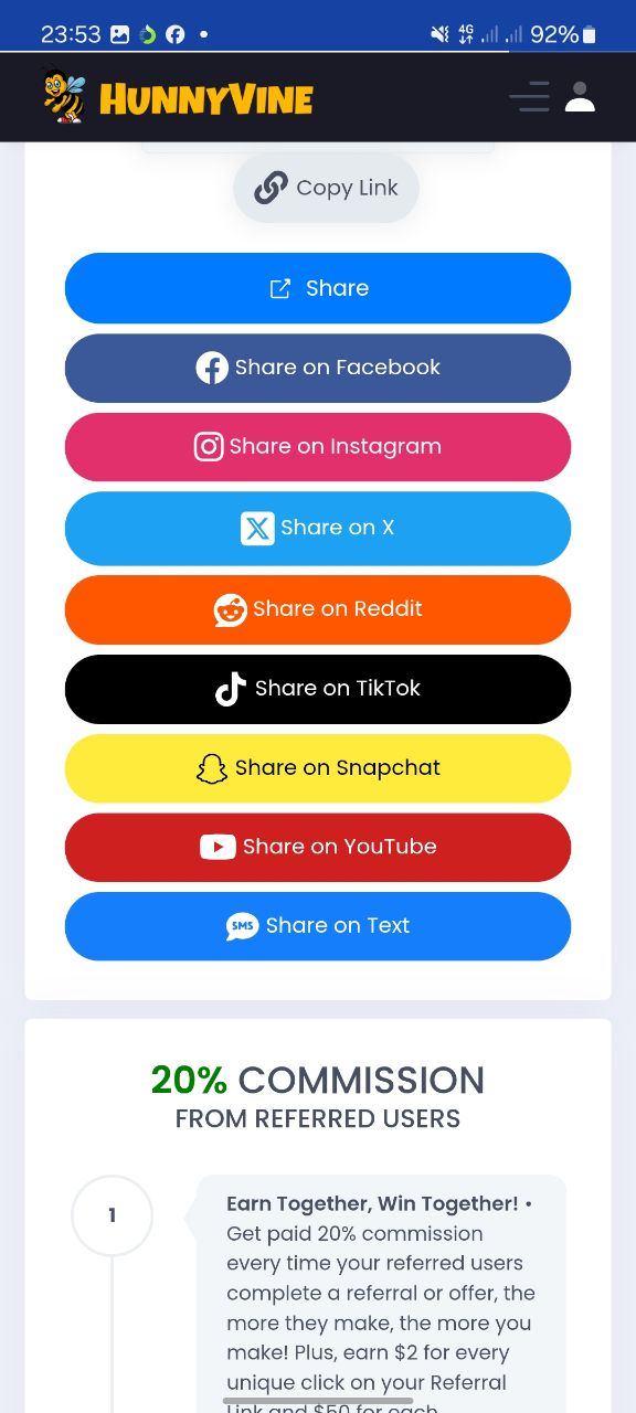 Hey everyone, it's me, your go-to guy for checking out these online money-making gigs. I've been diving into side hustles and earning apps for years now, and today I'm breaking down Hunnyvine.com (or just Hunnyvine, as they call it). I stumbled upon this one while scrolling through social media—folks were posting referral links left and right, promising quick cash. It popped up as a "worldwide referral-based platform" where you can supposedly earn big by sharing links, completing tasks, and referring friends. Sounds tempting, right? Especially with that flashy $100 sign-up bonus they dangle in front of you.