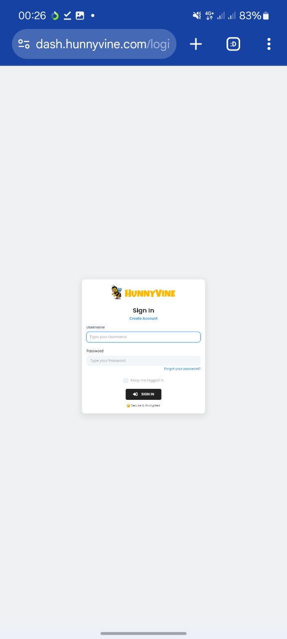 Login: https://dash.hunnyvine.com/login.php. Username, password, optional "Keep me logged in." Forgot password? They have a tip: Use Live Chat Support to report issues, but no standard reset form I could find.