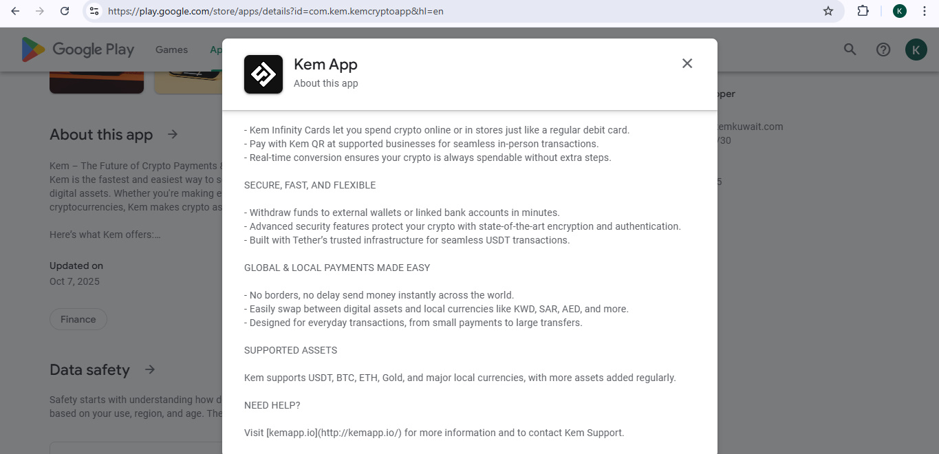 Kem, which stands for Kem App, is described as the fastest way to send, spend, and manage your crypto. It's a borderless banking and crypto financial platform that aims to make using cryptocurrency as seamless as cash. The app is primarily powered by USDT (Tether) and supports major digital assets.