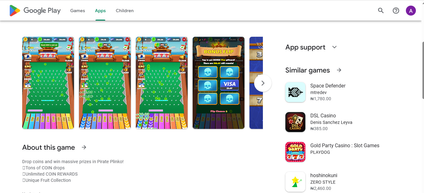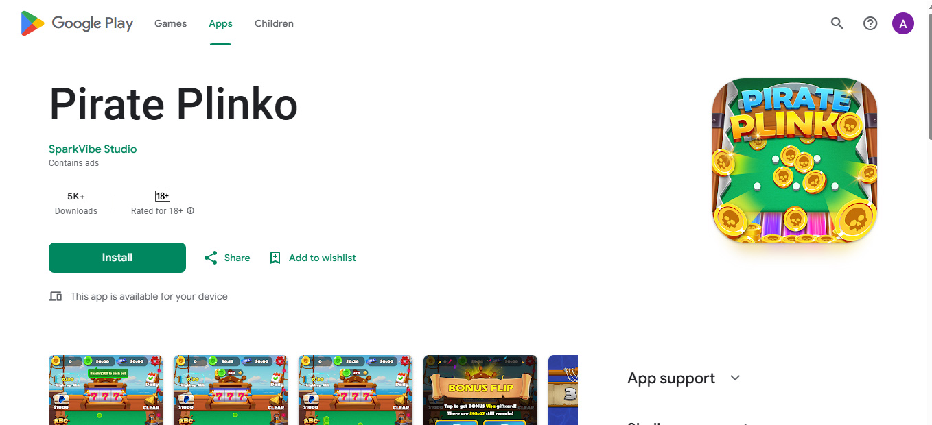 There is no transparency about who created Pirate Plinko. The game is published under generic developer names with no company registration, no physical office, and no customer support. This is a strong scam signal, as reputable apps proudly show their company and contact information.