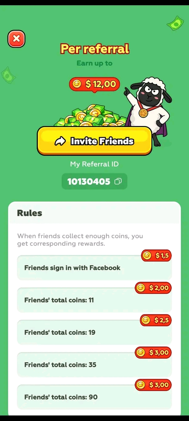 - Activity Bonus: You earn more as your friend plays. For example, when your friend's total coins reach 11, you get $2.00. When they reach 90 coins, you get $3.00.