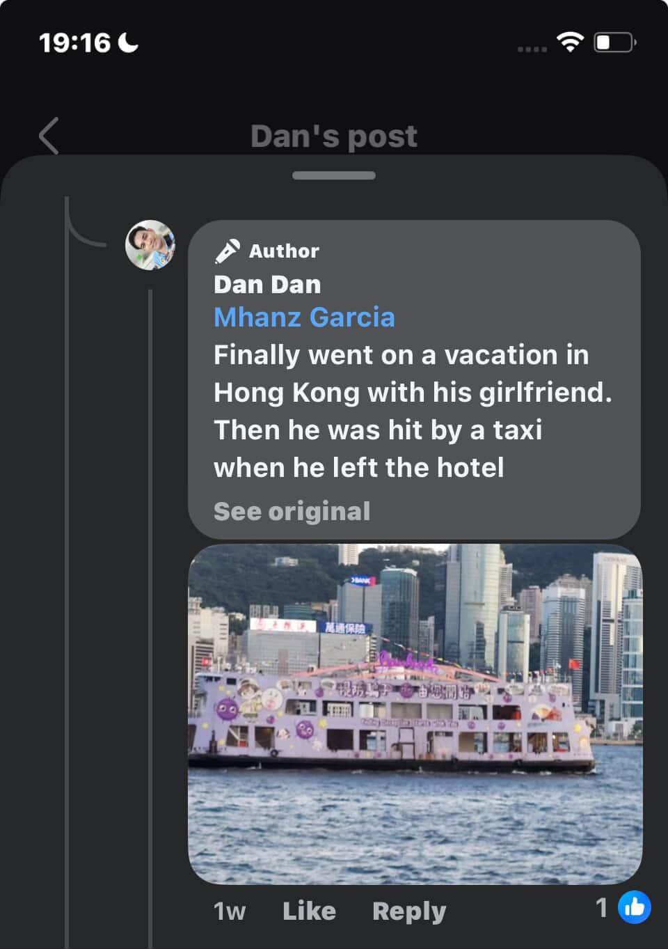 On August 5 at 14:15, when remyl matignas went comatose on floor. All the hongkong car group and taxi drivers group in Facebook all post that nina hotel photo and write this news and even request others to quickly find out what had actually happened, that why a ghost speed taxi runs in nina hotel road and even killed someone in such car speed.