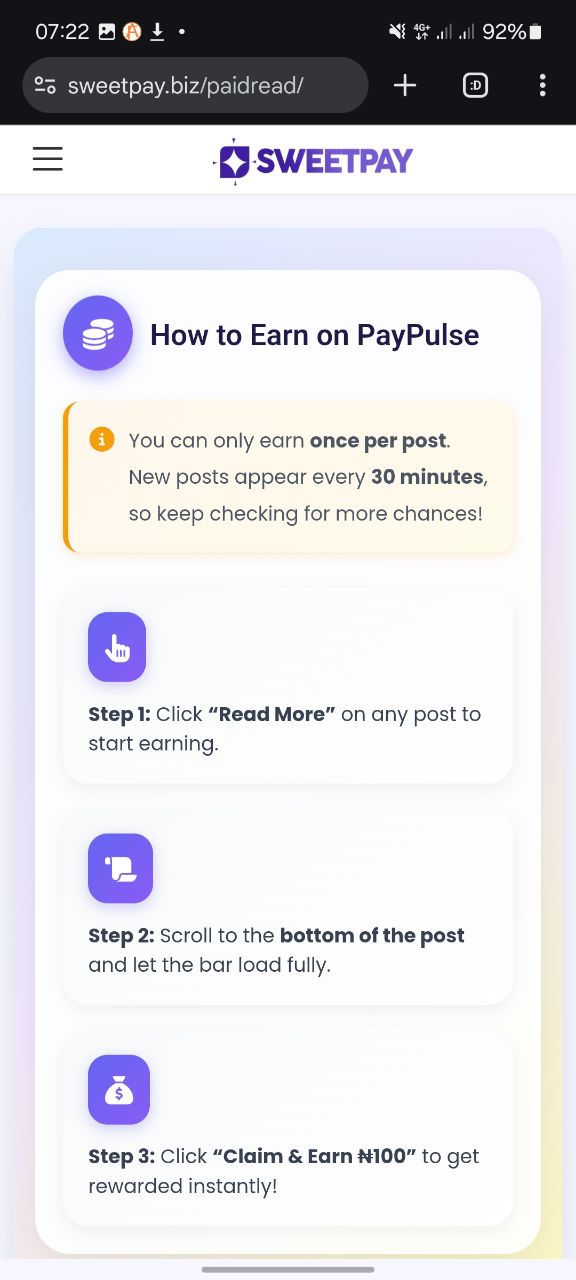 - PayPulse (Read to Earn): Users earn money (e.g., ₦100) by clicking "Read More" on news posts, scrolling to the bottom, and waiting for a timer to finish.