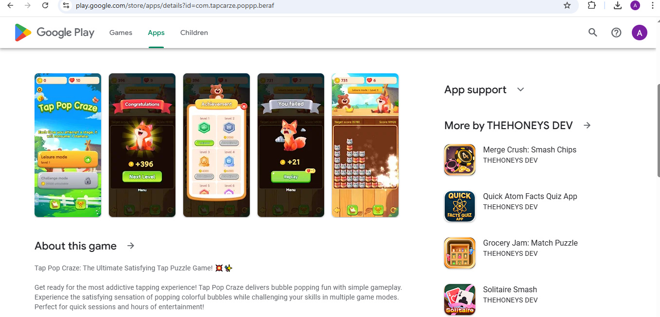 One of the first red flags is the lack of transparency about who developed Tap Pop Craze. The app has no official website, no identifiable CEO, and no clear company details. Instead, it hides behind a generic developer account on the Google Play Store. This is common among scammy “cash game” apps – they avoid accountability by staying anonymous.