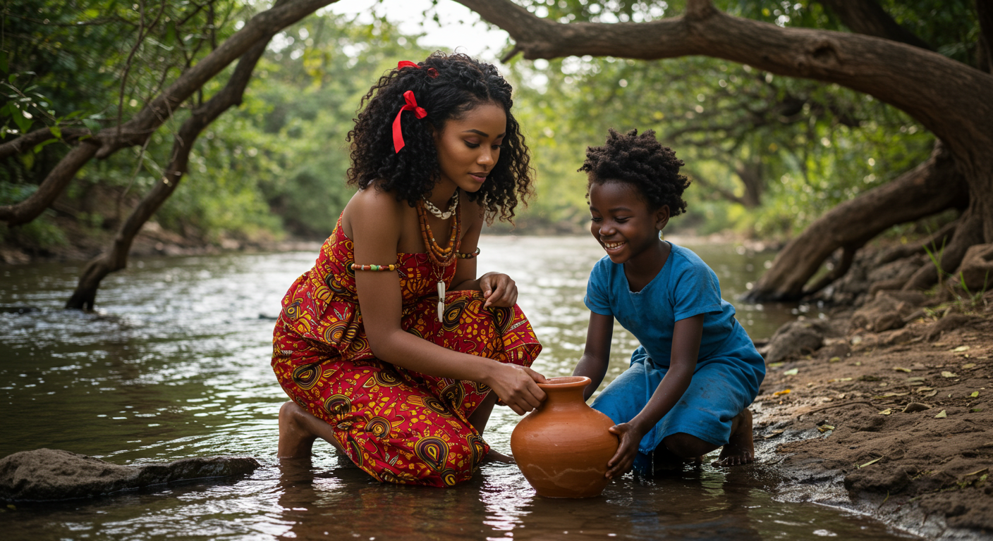 Not far away, Amara, the daughter of Chief Olowu, was with her friend Ayo. They fetched water by the river. Amara whispered, “Ayo, my heart is full. I like the crown prince.”