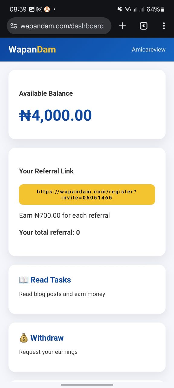 Over the past few days, I kept seeing WapanDam everywhere on Facebook groups, WhatsApp broadcasts, and Telegram channels. People were sharing referral links aggressively, claiming things like “₦4,000 welcome bonus”, “₦750 per task”, and “fast withdrawal to local bank”. As usual with platforms that suddenly trend this fast, I decided to slow down, register, explore the dashboard, check the tasks, analyze the withdrawal system, and compare everything with similar platforms we’ve seen before.