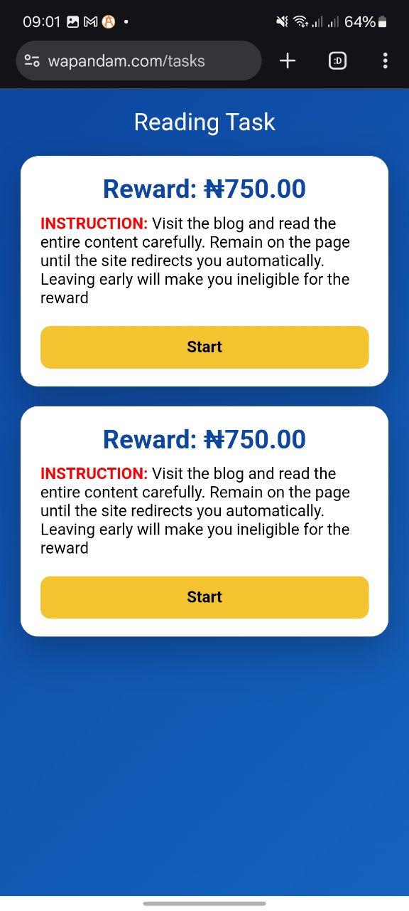 - Complete “Reading Tasks” — visit a blog, read the content, and stay on the page until it redirects you. Each task pays ₦750.