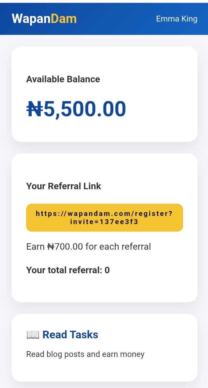 - Daily Tasks for Earnings: The main gig is super simple: Read blog posts on the site and earn ₦1,500 per day. Other tasks include watching short ads, completing quick surveys, or clicking links. It's low-effort, supposedly taking just 10-20 minutes. Some reviews mention ₦750 per individual task like reading a single blog, which adds up if you do a few.