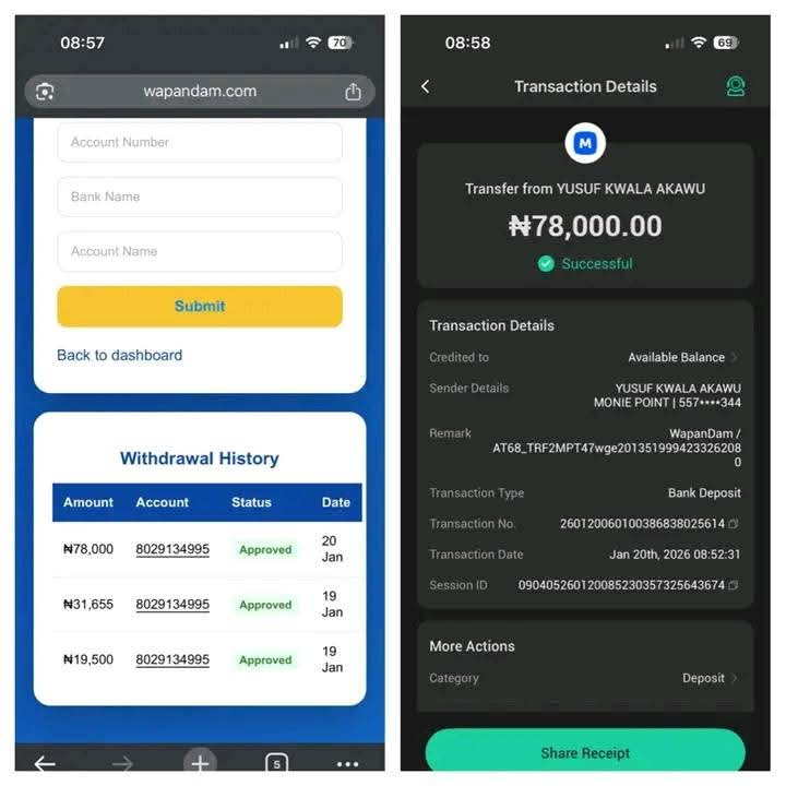 - On Facebook: In Nigerian "Make Money Online" groups, there are posts hyping Wapandam with referral links and "payment proofs." One user claimed they withdrew ₦24,115 and shared a bank alert screenshot. But the same image pops up in multiple places, which screams coordinated promotion. No major complaints yet, but in similar groups, people warn about apps like this that pay early then ghost. Searches for "wapandam.com reviews" on Facebook mostly led to unrelated posts about restaurants or random stuff—no deep discussions.