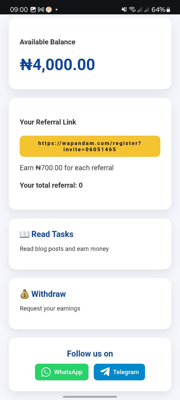 - Referral Bonus: You earn ₦700 for every friend you invite to the platform.