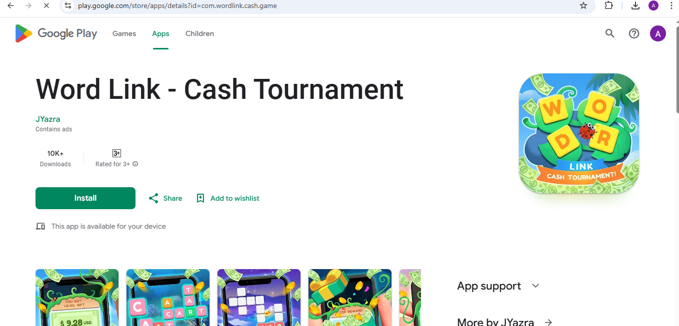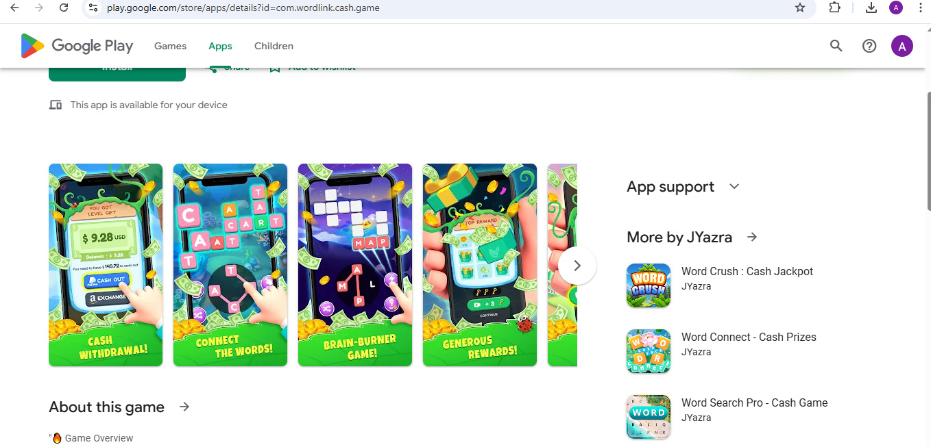 The app doesn’t list a transparent CEO or development company. Usually, such apps are made by anonymous developers who publish under generic studio names and vanish once negative reviews pile up. Legit apps normally have verifiable publishers and support details – Word Link – Cash does not.
