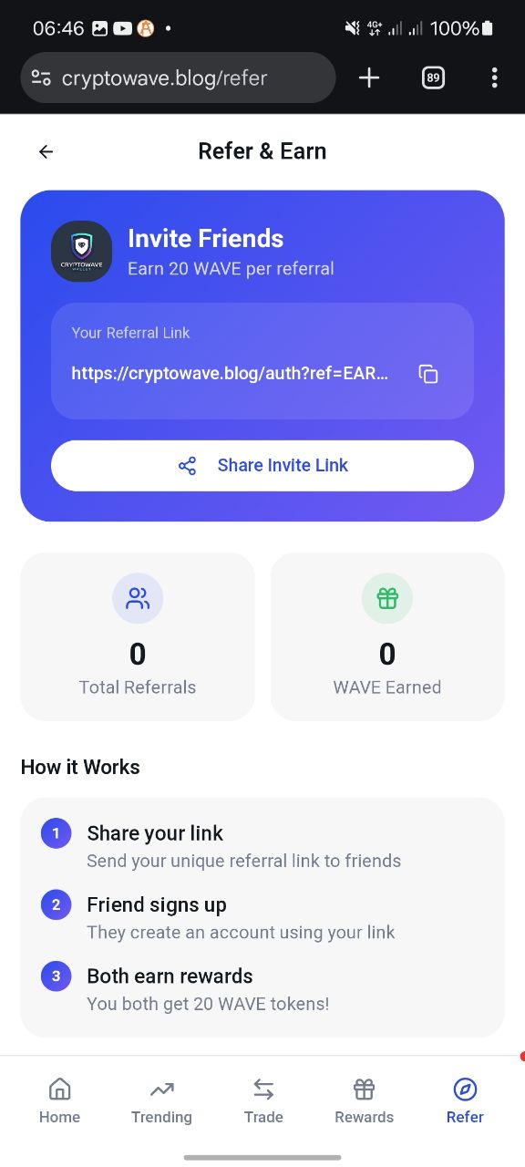 - Tracking: The app has a dedicated "Refer" section where you can track your total referrals and total WAVE earned from your network.