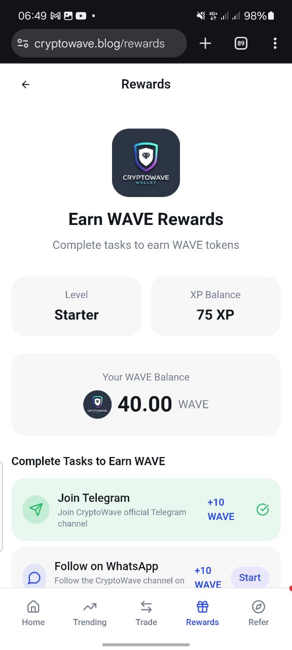 - Social Tasks: Users earn tokens by joining official social media channels. For instance, joining their Telegram, following their WhatsApp channel, or liking their Facebook page can net you about +10 WAVE tokens per task.