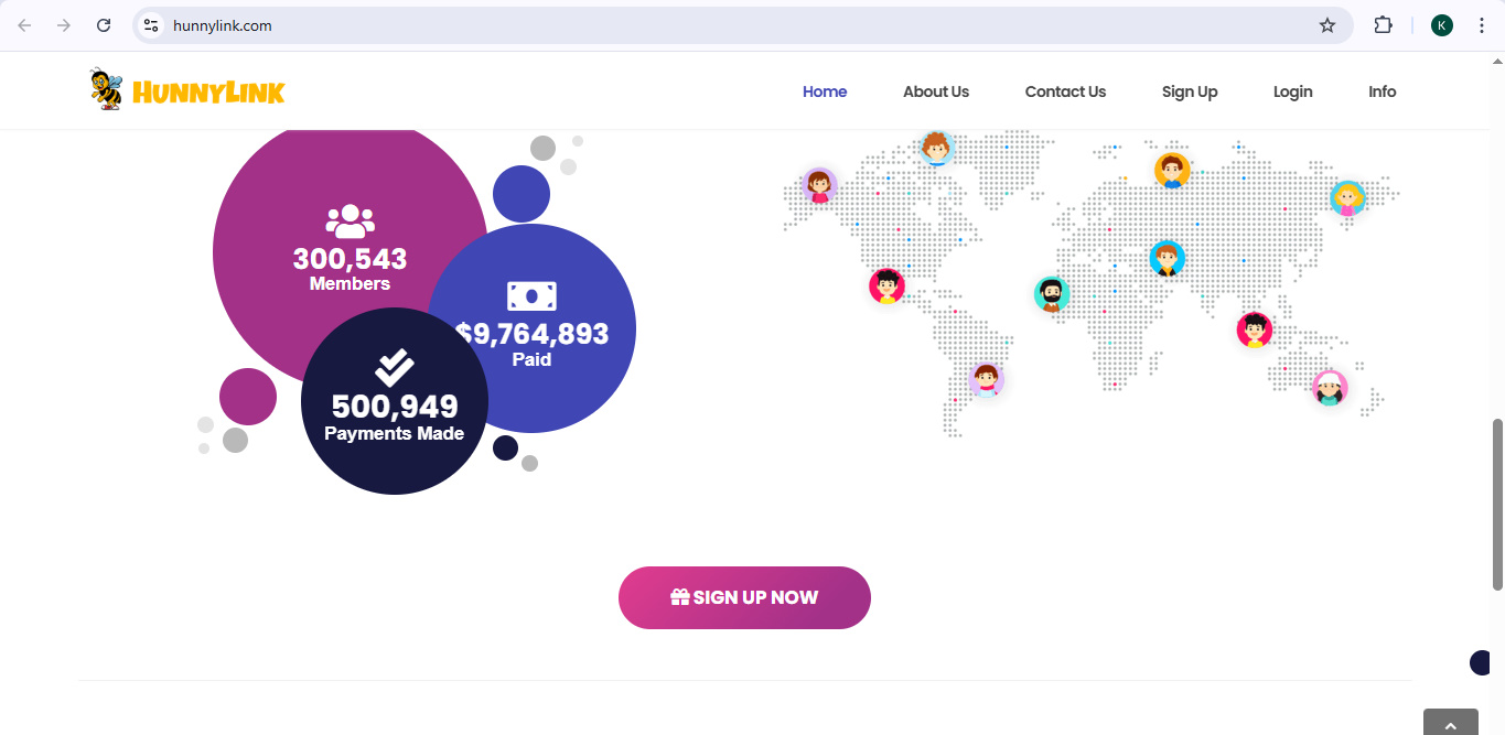 Hunnylink markets itself as a global platform for earning money online, with multiple revenue streams: