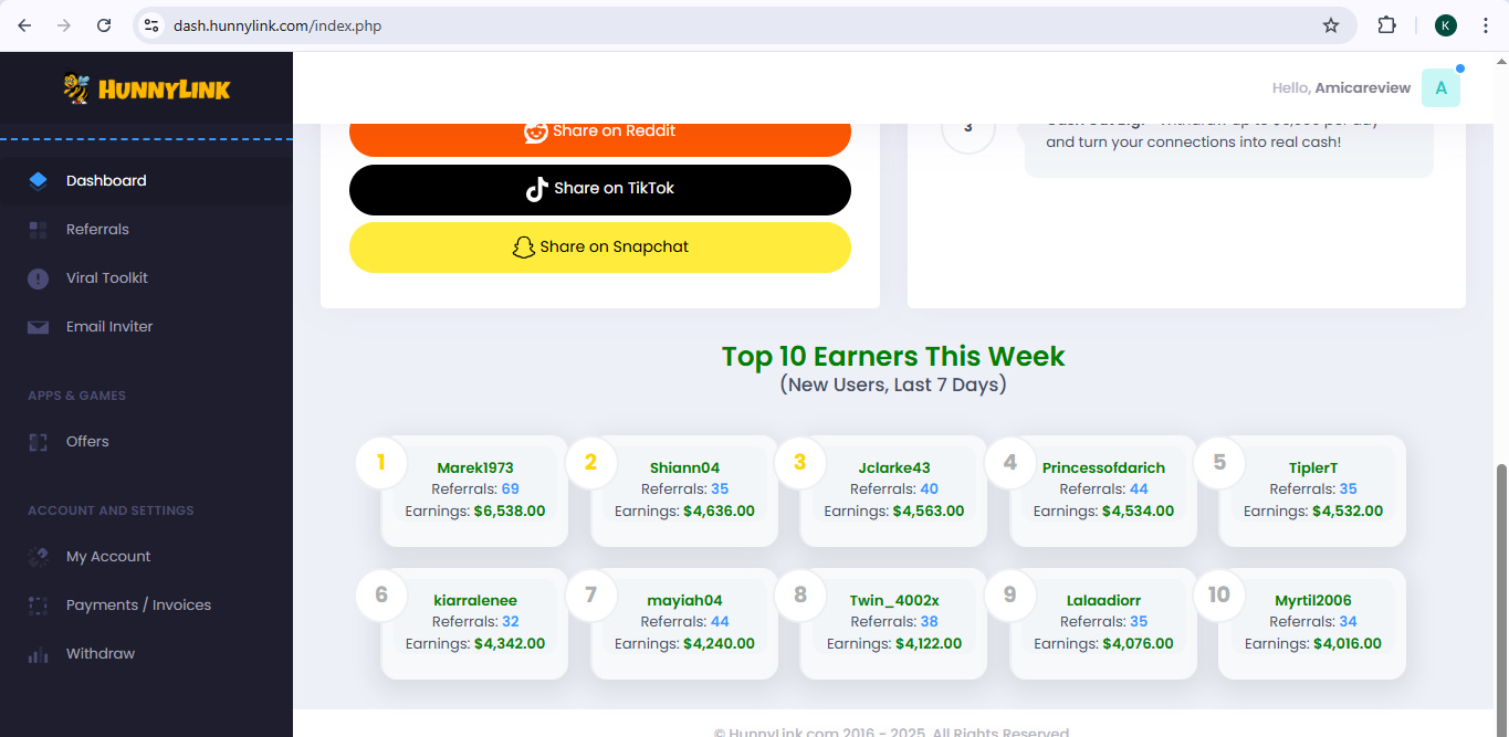 Hunnylink claims you can earn thousands daily — just like the “Top 10 Earners” leaderboard it displays: