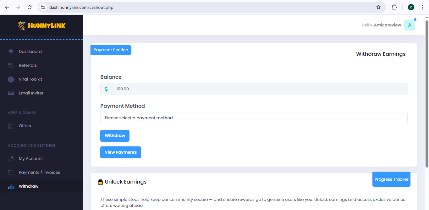 However, before you can withdraw, Hunnylink requires you to complete “security steps” — like referring at least 3 users and finishing offers to “unlock” your account.