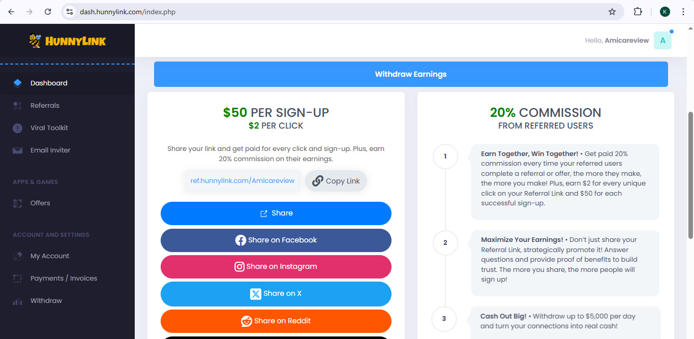 The Dashboard:Â After logging in, you see your balance, your unique referral link (e.g.,Â