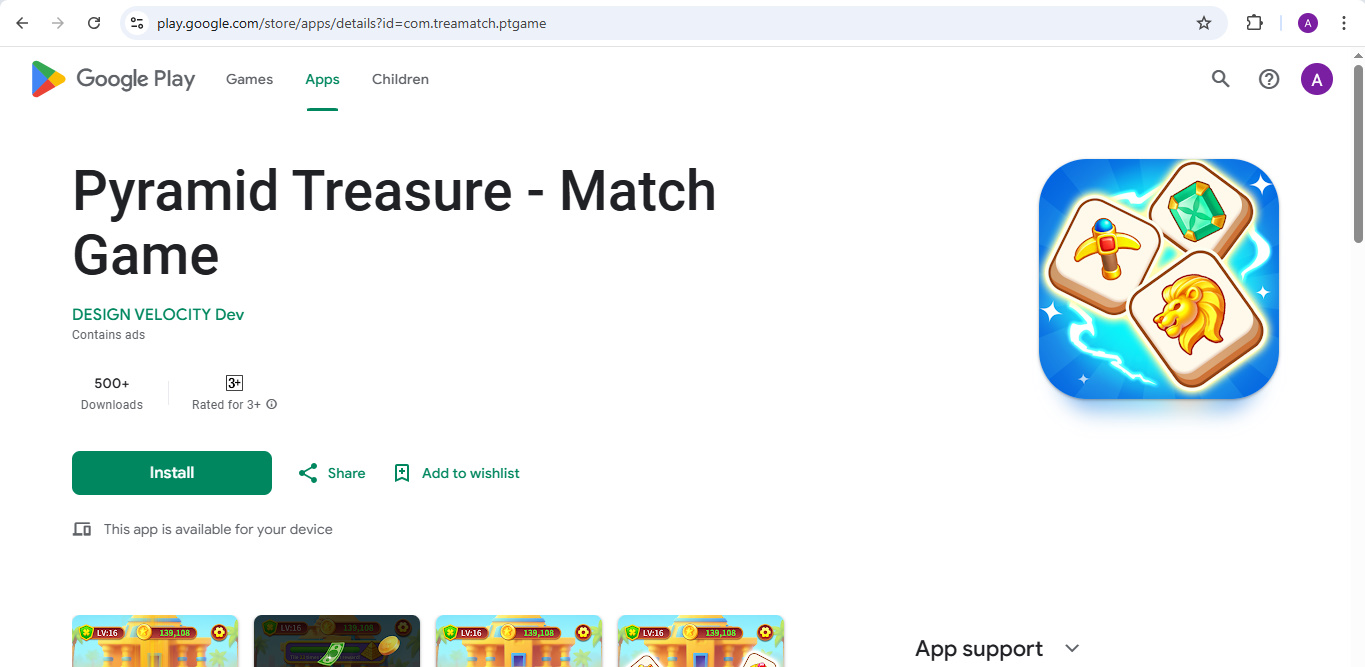 I came across Pyramid Treasure: Match Game after seeing multiple ads claiming you could earn $100 USD instantly just by matching tiles and installing a few in-game widgets. The game’s advertisements are designed to look like real earning opportunities — you match two identical tiles, collect rewards, and supposedly cash out real money.