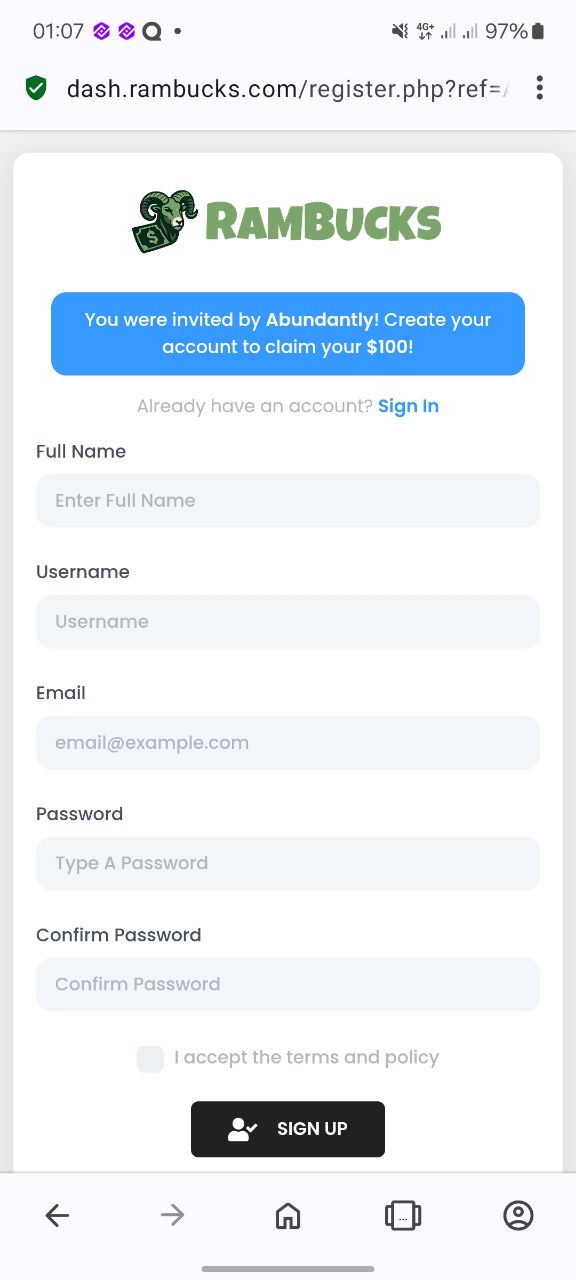 If you’re curious how the Rambucks sign-up system looks, here’s the exact process users follow:
